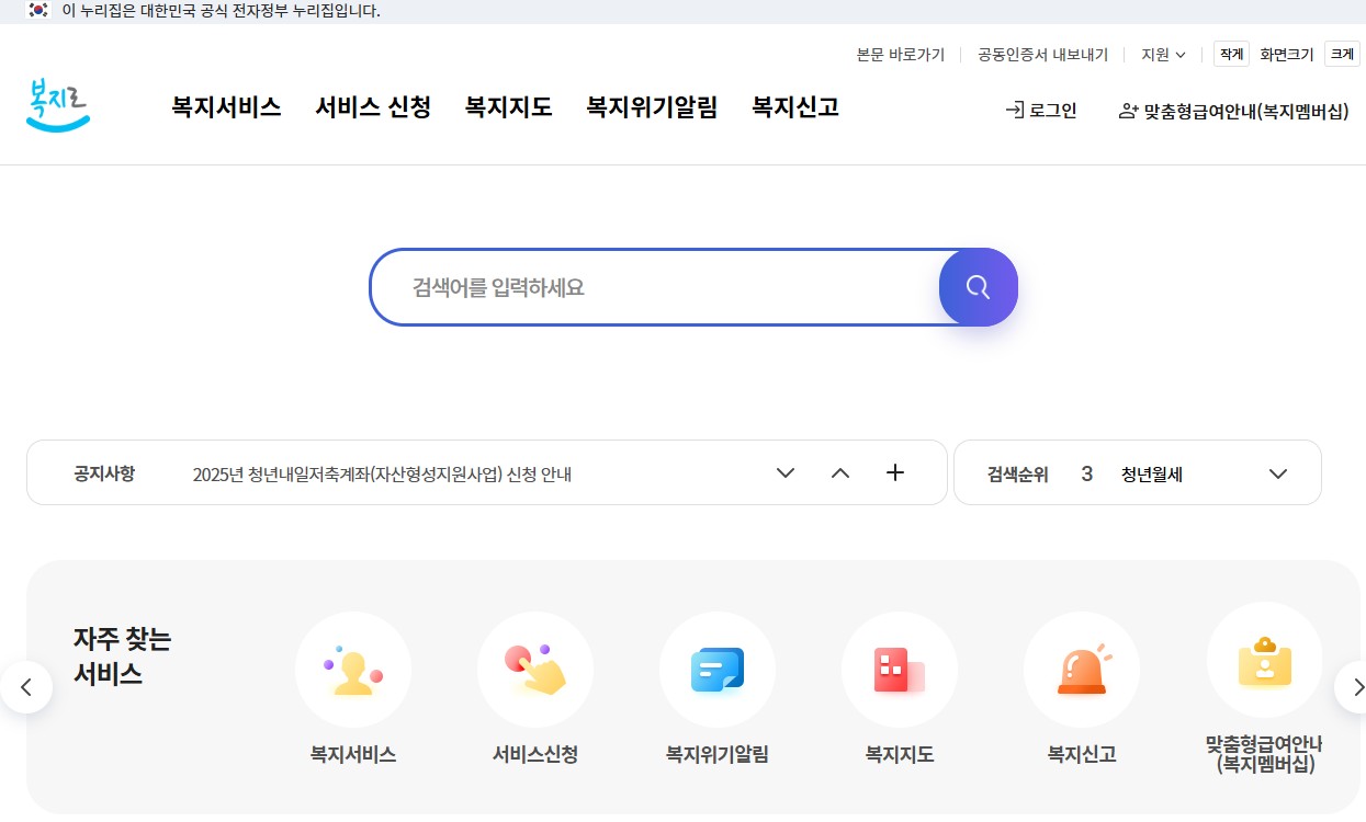 온라인 신청 복지로(https://www.bokjiro.go.kr)