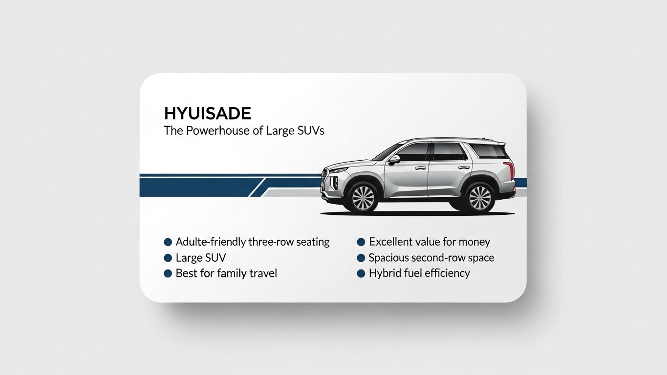 | 팰리세이드 | 대형 SUV | ★★★★★ | ★★☆☆☆ | 3열까지 사람답게 타는 진짜 대형 SUV | 자녀 2명 이상, 3대 가족 |