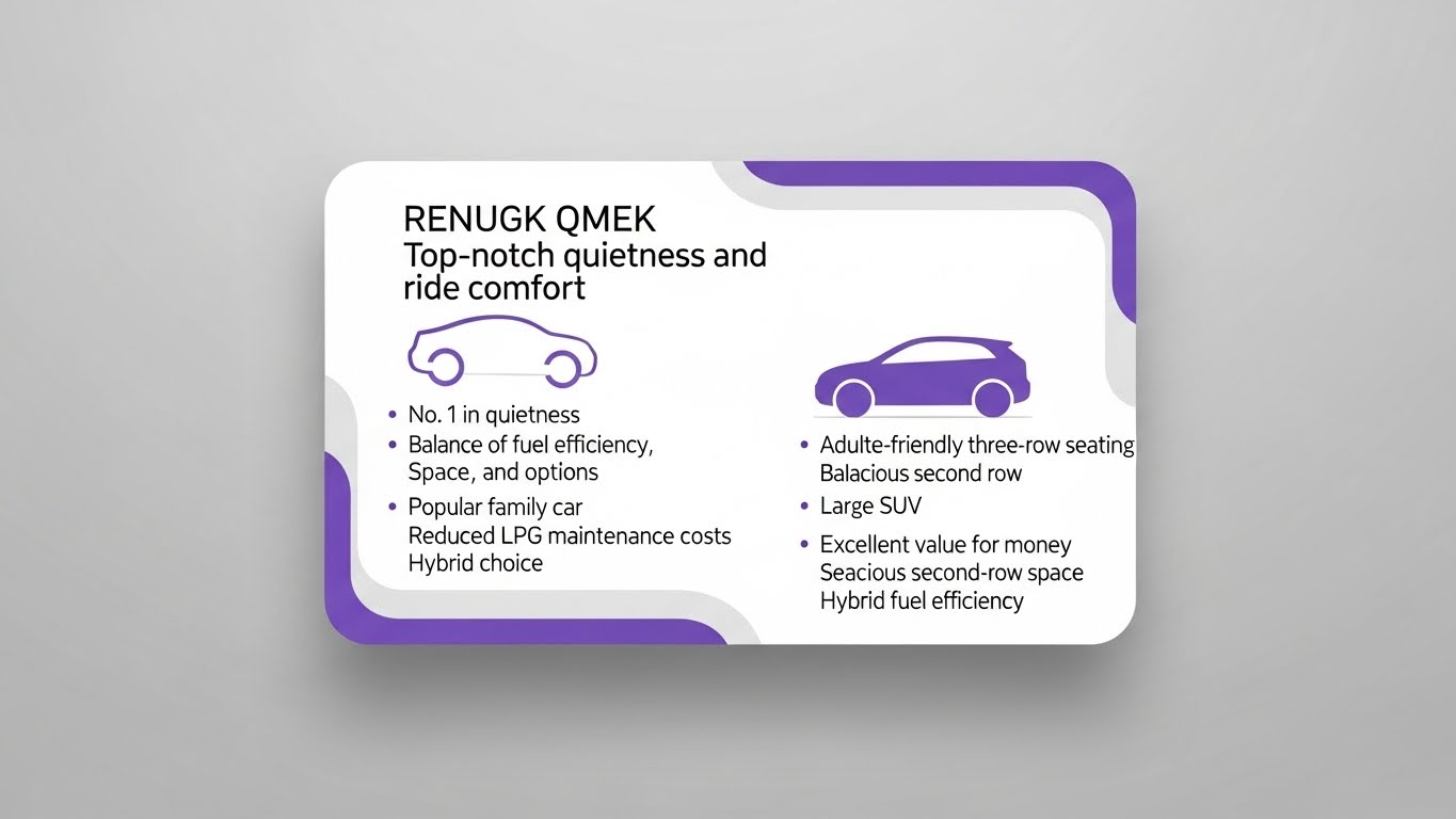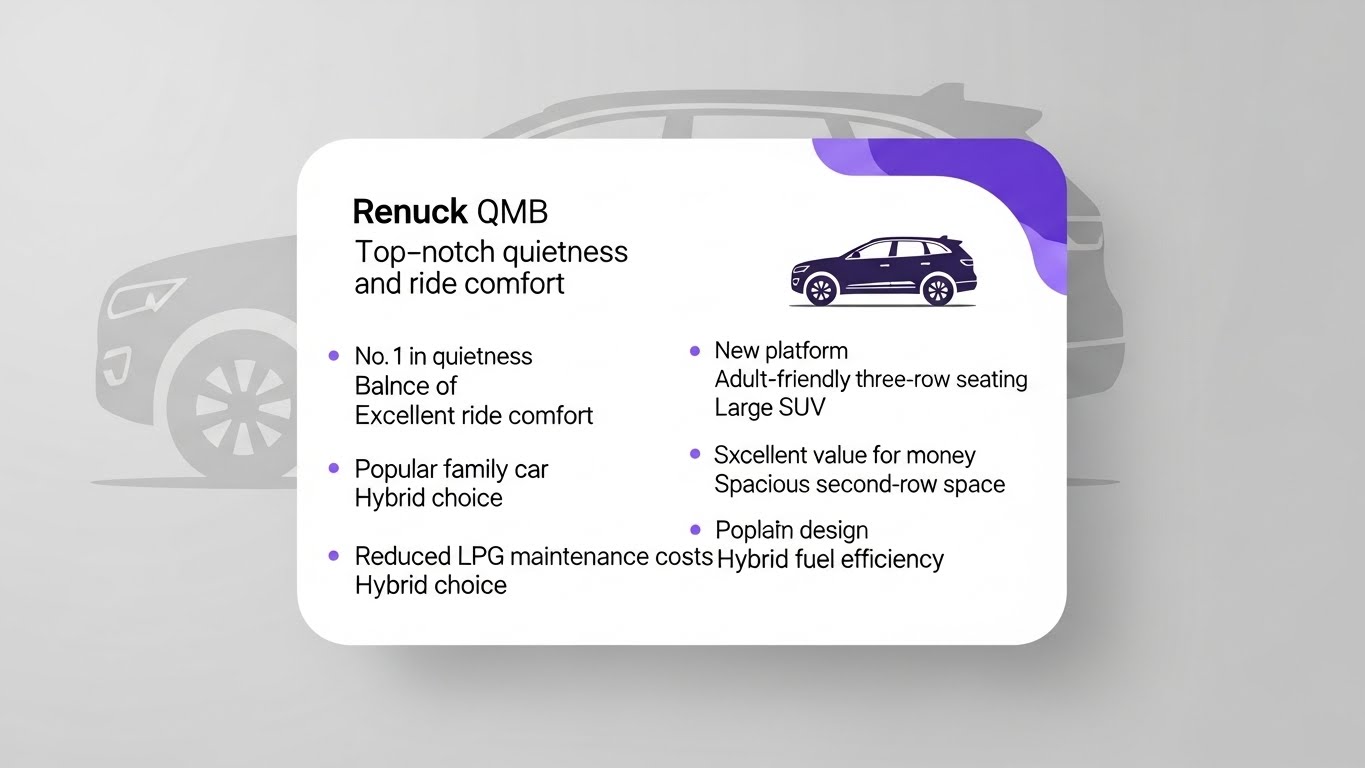 | QM6 | 중형 SUV | ★★★★☆ | ★★★☆☆ | 정숙·승차감에 올인한 패밀리 SUV | 조용한 차 원하는 가족 |